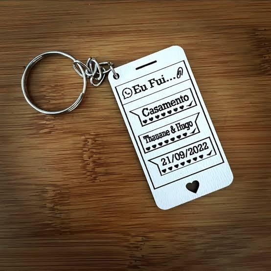 confeccionado em MDF de alta qualidade, com acabamento a laser. O design é inspirado em uma tela de aplicativo de mensagens, trazendo a inscrição "Eu Fui..." e detalhes personalizados para casamento, como os nomes dos noivos, a data do evento e símbolos de coração. Ideal como lembrancinha de casamento, o chaveiro combina criatividade, delicadeza e um toque moderno. Um mimo que vai fazer os convidados lembrarem desse dia especial com muito carinho.